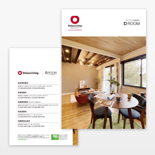 さらに、5営業所共通で使用できる設計 とし、森林育成紙®を使用した環境配慮印刷 で企業姿勢もさりげなくアピール。初稿のデザインを大変気に入っていただき、微修正のみで本社確認もスムーズに校了しました。