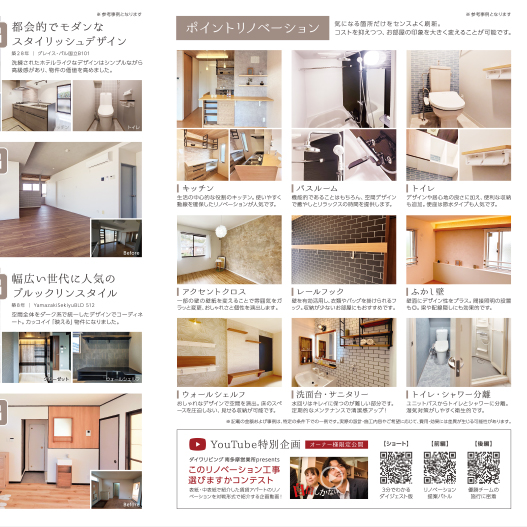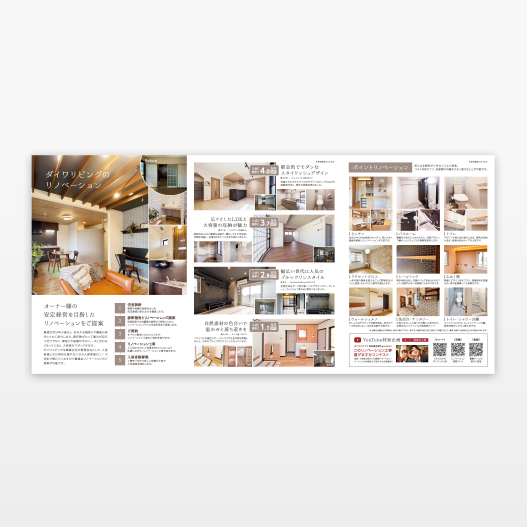 制作にあたり、まずはオーナー様に届けたい情報をヒアリングし、構成・レイアウトを打合せのうえで決定しました。「施工事例を多く掲載したい」 というご要望に沿い、【リフォームで賃料を上げられること】【ポイントリフォームでも入居率が改善できること】を明確に訴求。
